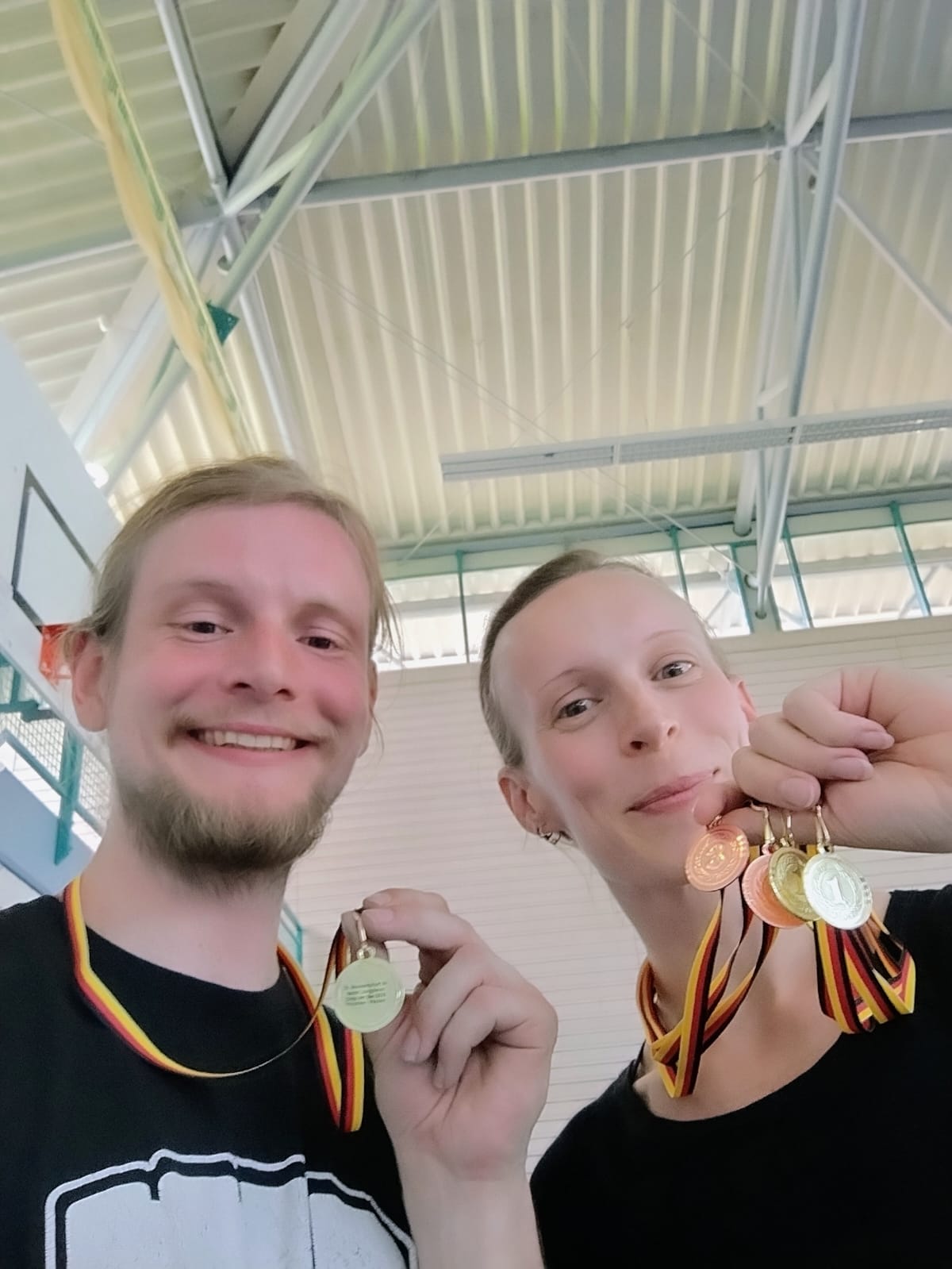 Auch 2025 gab es eine Deutsche Meisterschaft im technischen Jonglieren, bei der ich diese Preise einsammeln konnte: Gold in Keulenjonglage synchron mit Fabian Reese sowie Gold in Ringjonglage synchron mit Maximilian Kuschmierz. Bei den Solo-Kategorien schaffte ich zwei Mal Bronze mit Keulen und Ringen. Ein paar Video-Impressionen gibt's hier auf meinem Instagram-Account und hier das Siegerfoto mit Fabian: